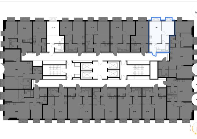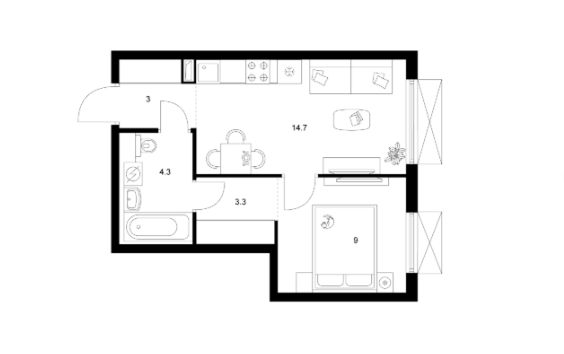 Площадь (кв.м.) | Общая: 34.3 Жилая: 9 Кухня: 14.7 34.3 / 9 / 14.7 |
